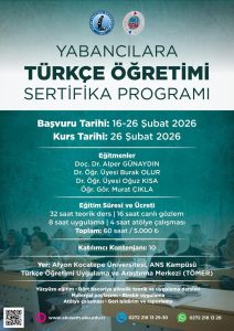 Afyon Kocatepe Üniversitesi Sürekli Eğitim Uygulama ve Araştırma Merkezi (AKÜSEM) ile Afyon Kocatepe Üniversitesi Türkçe Öğretimi Uygulama ve Araştırma Merkezi (TÖMER) iş birliğinde “Yabancılara Türkçe Öğretimi Sertifika Programı” düzenlenecektir. Program, yabancılara Türkçe öğretimi alanında kuramsal bilgi ile uygulamayı bir araya getirmeyi amaçlamakta; katılımcılara dört temel dil becerisine yönelik öğretim yöntem ve tekniklerini uygulamalı olarak kazandırmayı hedeflemektedir. Program kapsamında yüz yüze eğitim, dört beceriye yönelik teorik ve uygulama dersleri, materyal paylaşımı, birebir uygulamalar, atölye çalışmaları ile geri bildirim ve raporlama etkinlikleri yer almaktadır.